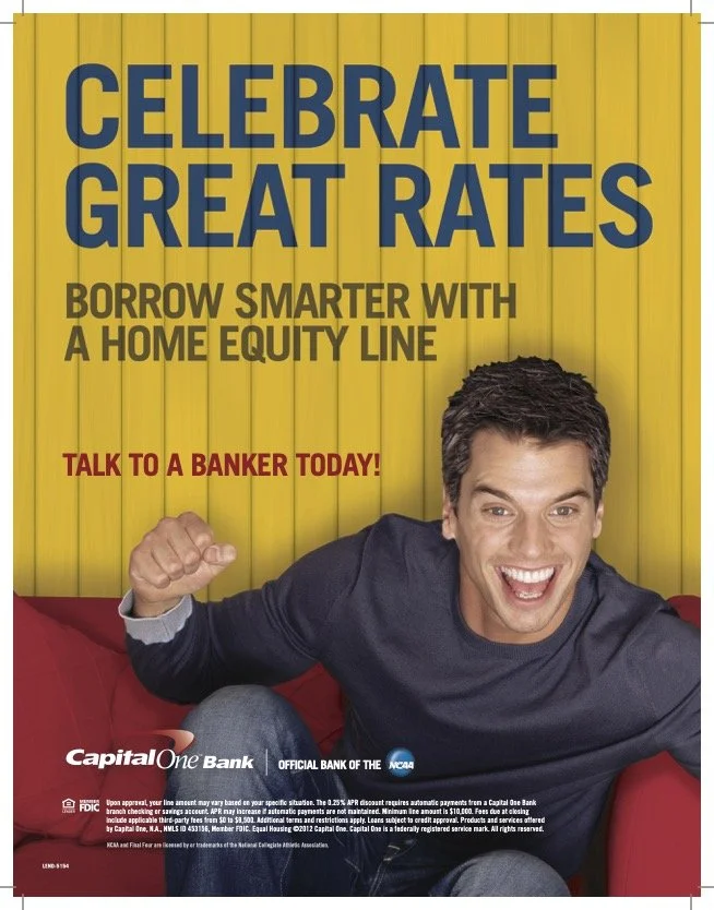To promote Capital One’s sponsorship of the March Madness that is the annual NCAA Basketball Tournament, I crafted this fan-centric In-Branch & Digital Campaign with clever tie-ins to the bank’s mobile and lending products that netted big points for textbook strategy, playful creative, and a winning uptick in sales.